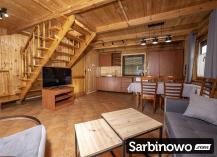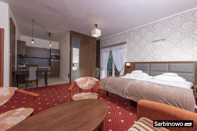 - salon połączony z aneksem kuchennym, rozkładany narożnik, fotel, stół, TV, telefon, dostęp do Internetu, sejf,